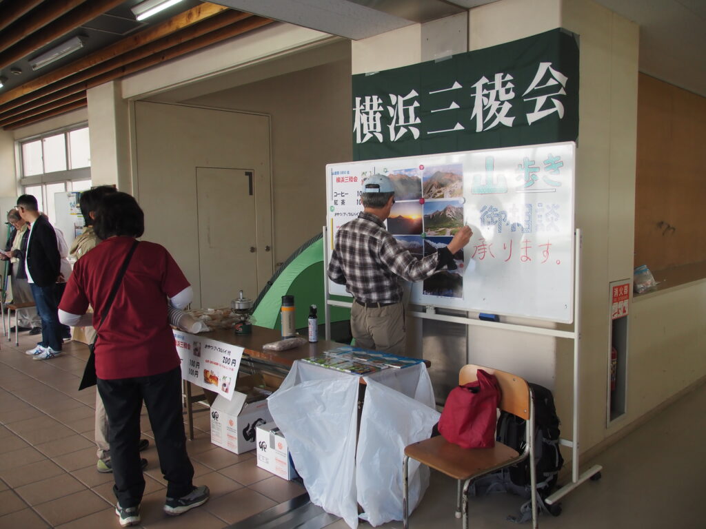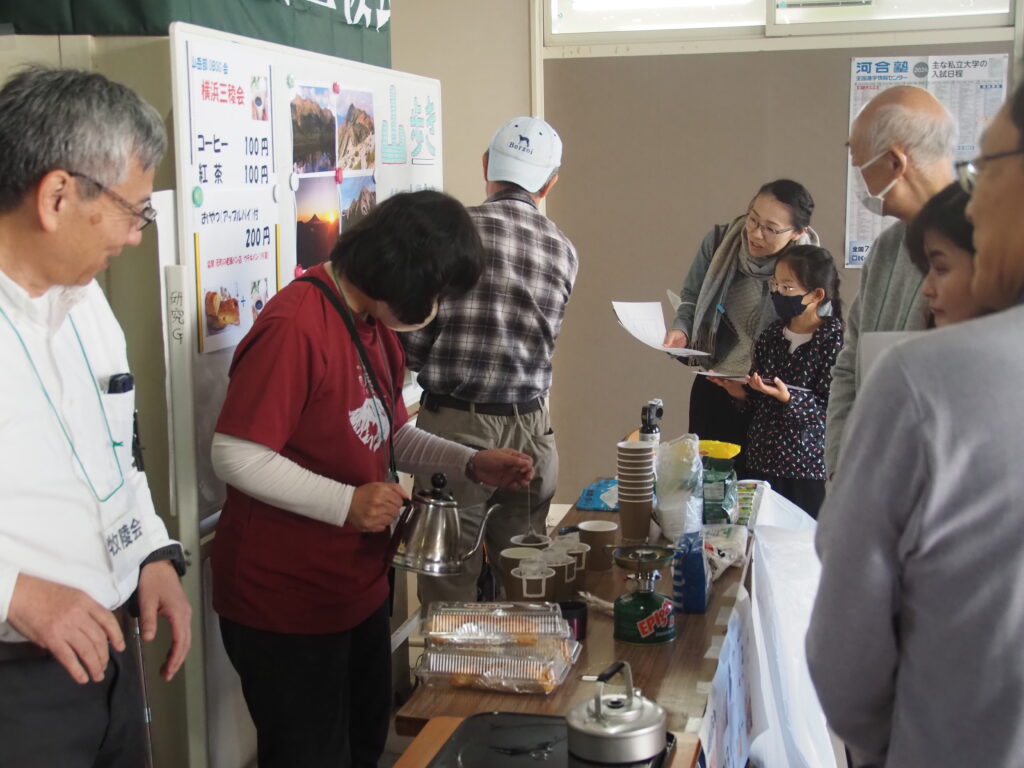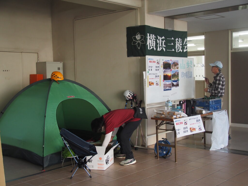 山岳部OBOGの喫茶コーナーは、テントサイトをイメージしたコーナーでコーヒー・紅茶を山麓からの水で提供されました。