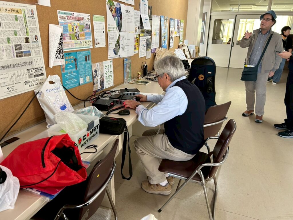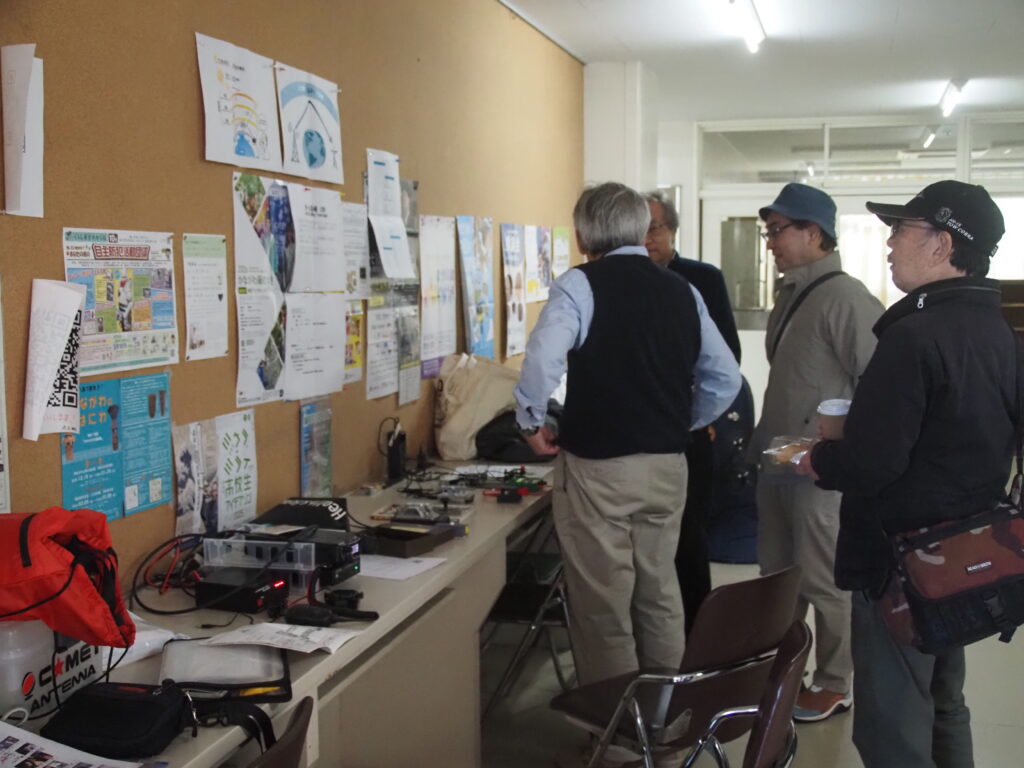 電気部OB会の無線デモでは、小さなチップで組み立てたモールス符号の練習機が展示され、モノ作りの魅力を示した展示となりました。