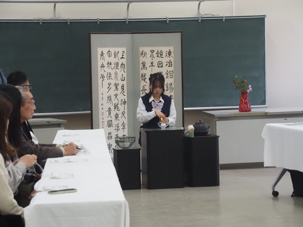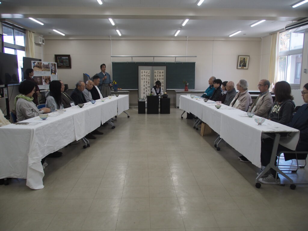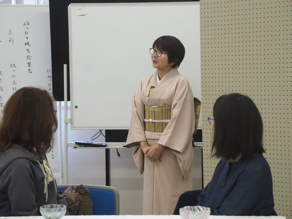高校35期のガラス作家の小西潮さんが講演を行いました。タイトルは「喫茶去」。繊細な作品の紹介とものづくりへの想いが語られました。また緑高茶道部の現役生とのコラボレーションによって、和菓子と抹茶が振る舞われ、小西さんが手がけたガラス茶器で味わいながら、講演に耳を傾ける贅沢な時間になりました。